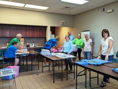 Many hands make quick work! Friends of TGSP gather to sort and fold 'I Survived the Stairs' t-shirts to prepare them for sale in the retail shop.
